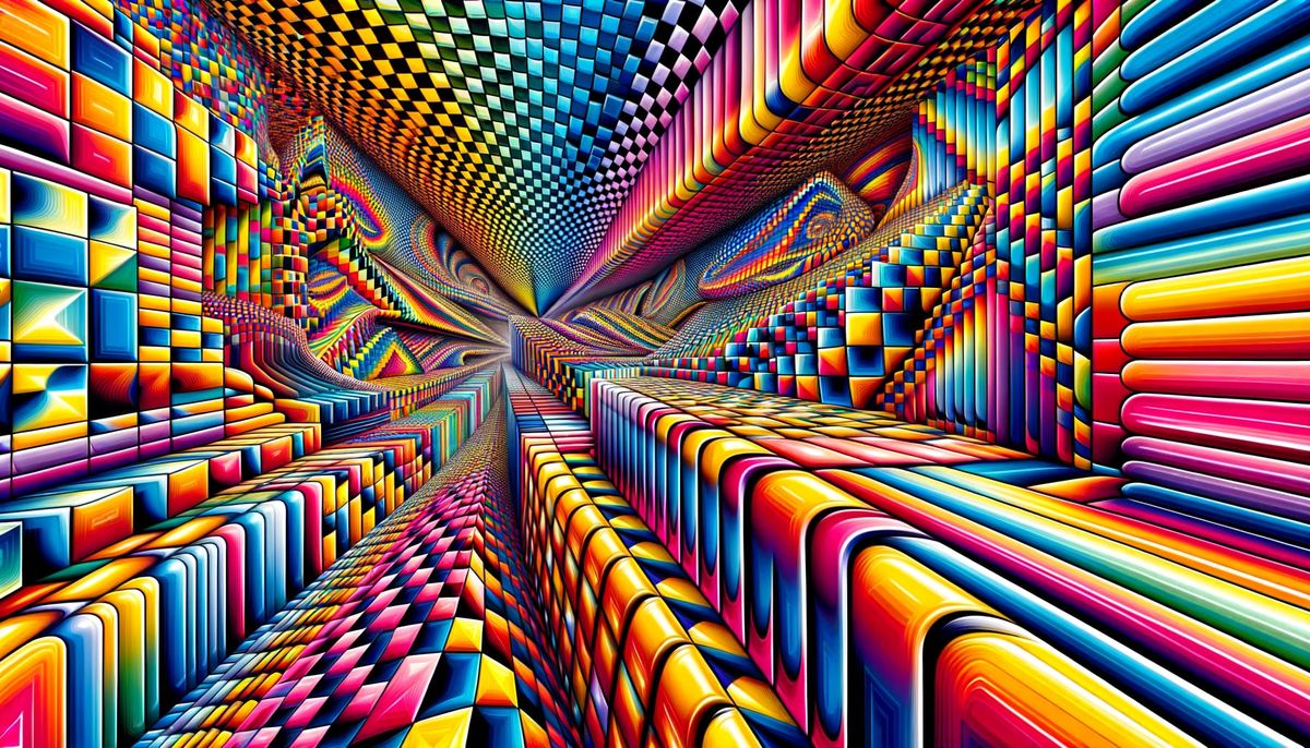 This vibrant image showcases a mesmerizing gingham pattern with carefully arranged geometric shapes, creating a kaleidoscope of colors that intensify towards the center, reminiscent of mid-20th century optical illusions and distortion effects.