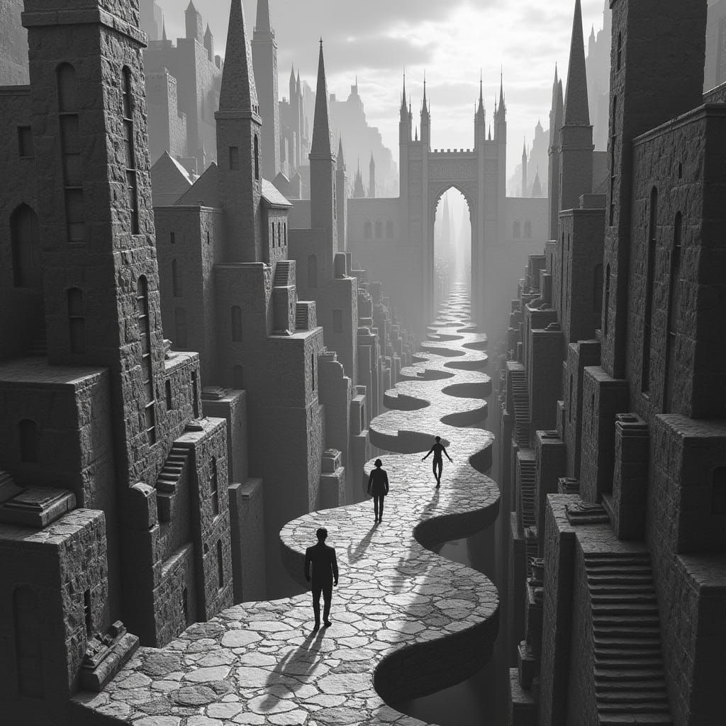 This image shows a haunting, surreal cityscape with paradoxical stairways and labyrinthine alleys, evoking a sense of foreboding and uncertainty, with human silhouettes navigating the fantastical and unsettling architecture, reminiscent of M.C. Escher's style.