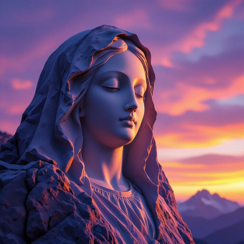 A breathtaking fantasy illustration of a majestic rock mountain featuring the serene face of the Madonna. Illuminated by twilight's golden hour glow, with vibrant purple and orange skies.