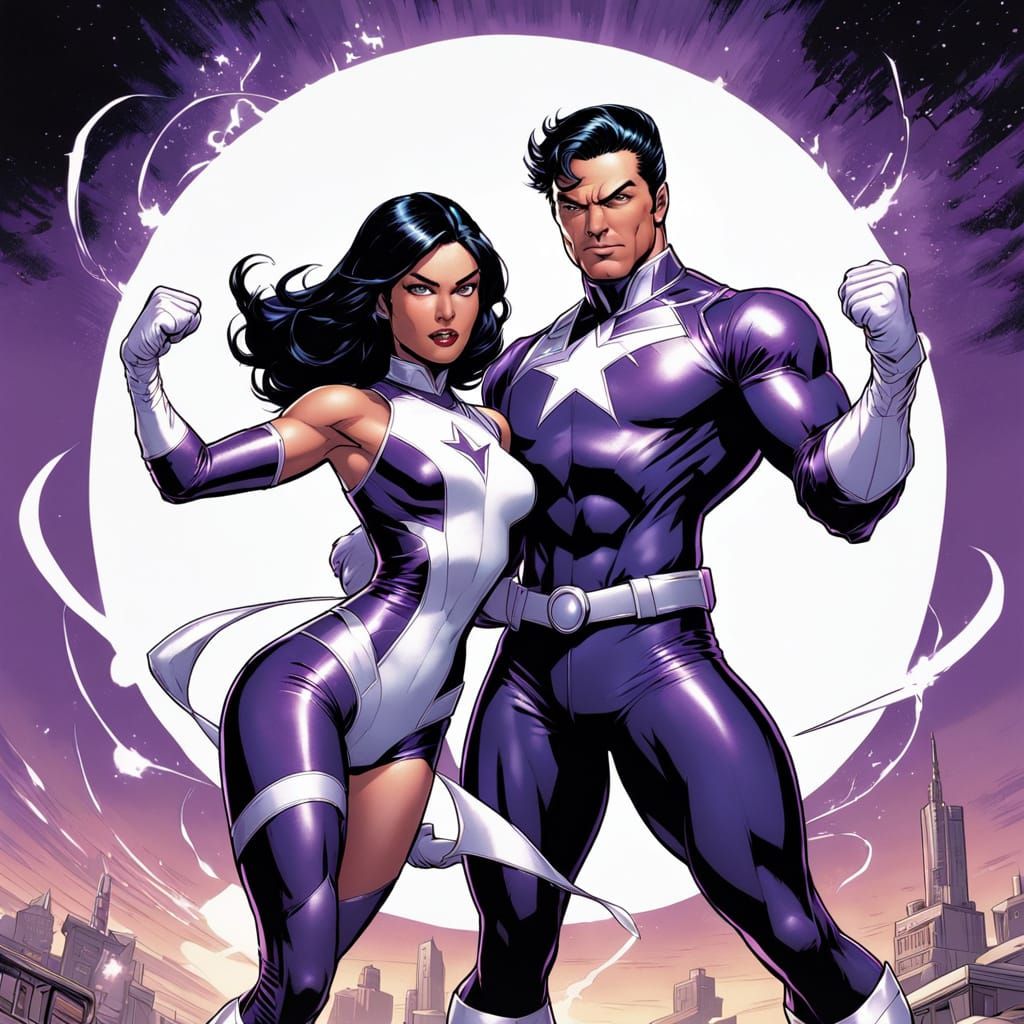 This image shows a dynamic duo of superheroes in matching purple spandex with white accents, striking a powerful pose with their arms extended in a gesture of solidarity, created in the style of smooth comic book art.