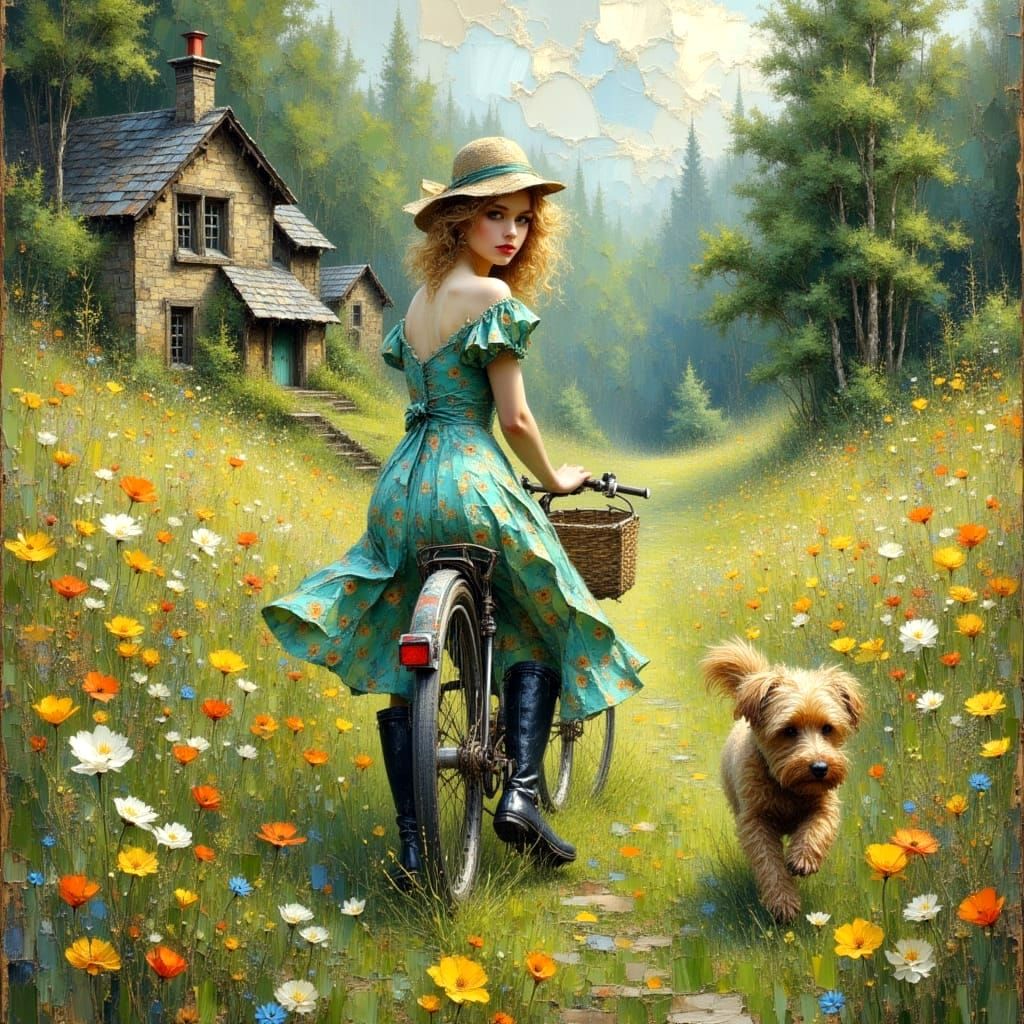 A vibrant image of a woman and dog in a wildflower field. The scene evokes a painterly, dreamlike quality with soft pastel colors and impasto techniques, reminiscent of vintage storybook illustrations.