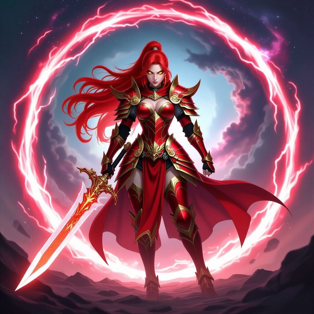 This image shows a powerful female warrior with flowing red hair and striking eyes, adorned in red and gold dragon knight armor. She wields a mystical sword amid swirling red lightning and cosmic nebulae, rendered in an anime-inspired style.