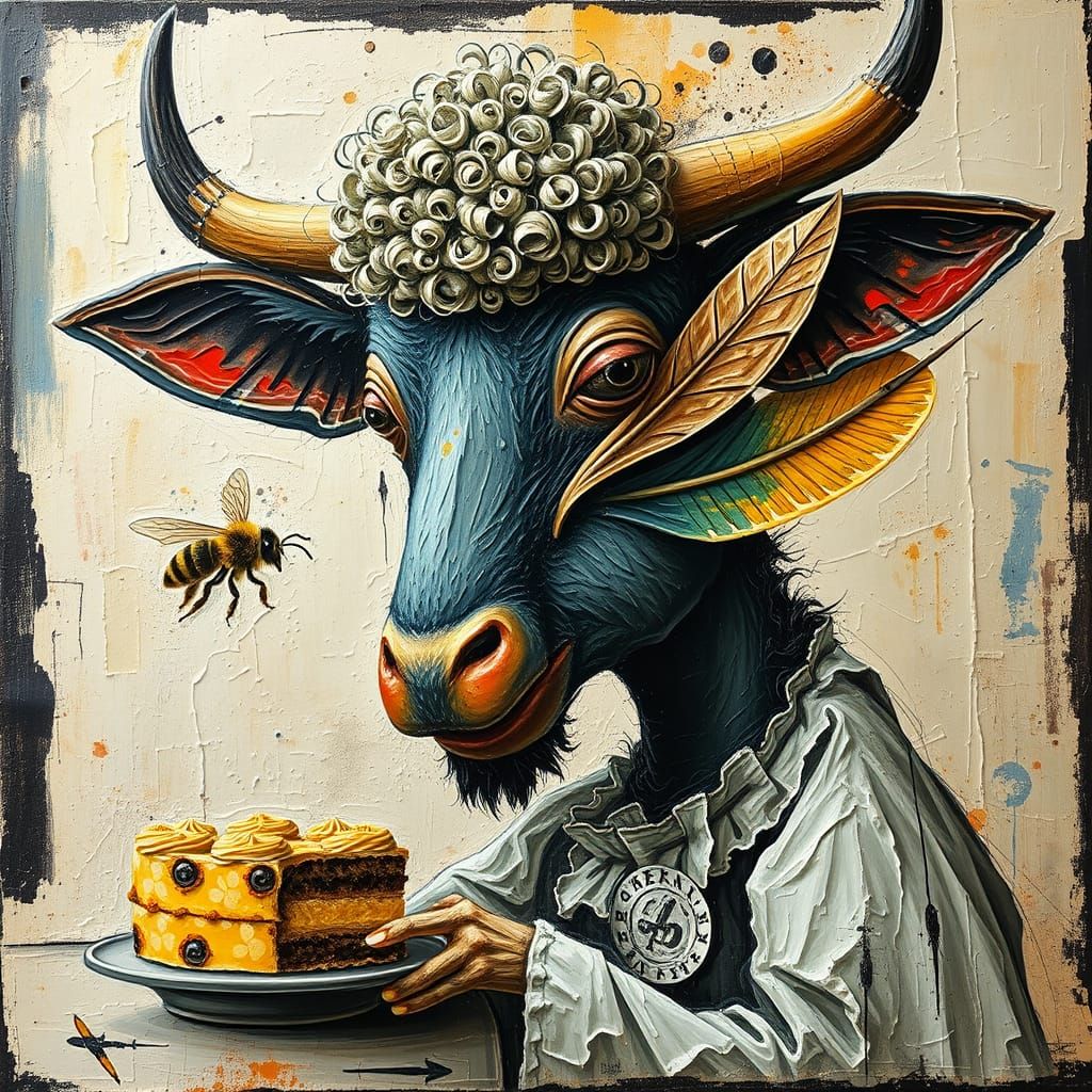 This abstract artwork features a surreal, impasto-style scene of a woman with curly hair, eating a cake and surrounded by insect body parts, in a vibrant and dreamlike atmosphere.