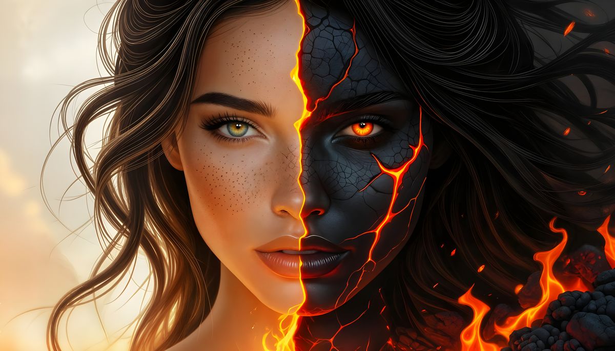 A captivating image of a woman's face, split between radiant beauty and volcanic destruction. The artwork features intricate details, high contrast and a moody, cinematic atmosphere.