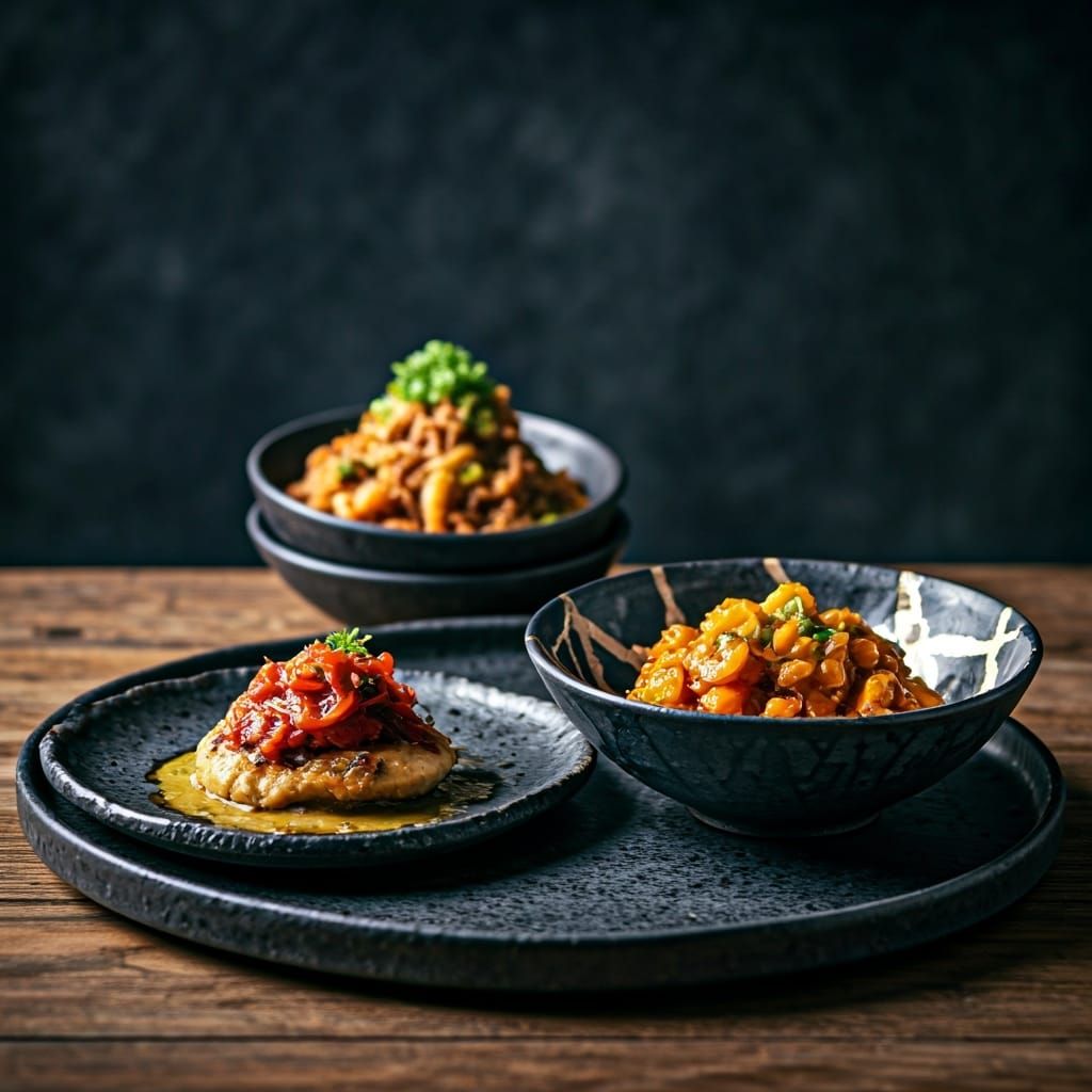 This image showcases food photography using traditional Japanese pottery. The composition features raku ware plates and kintsugi bowls, highlighting the beauty of imperfection.