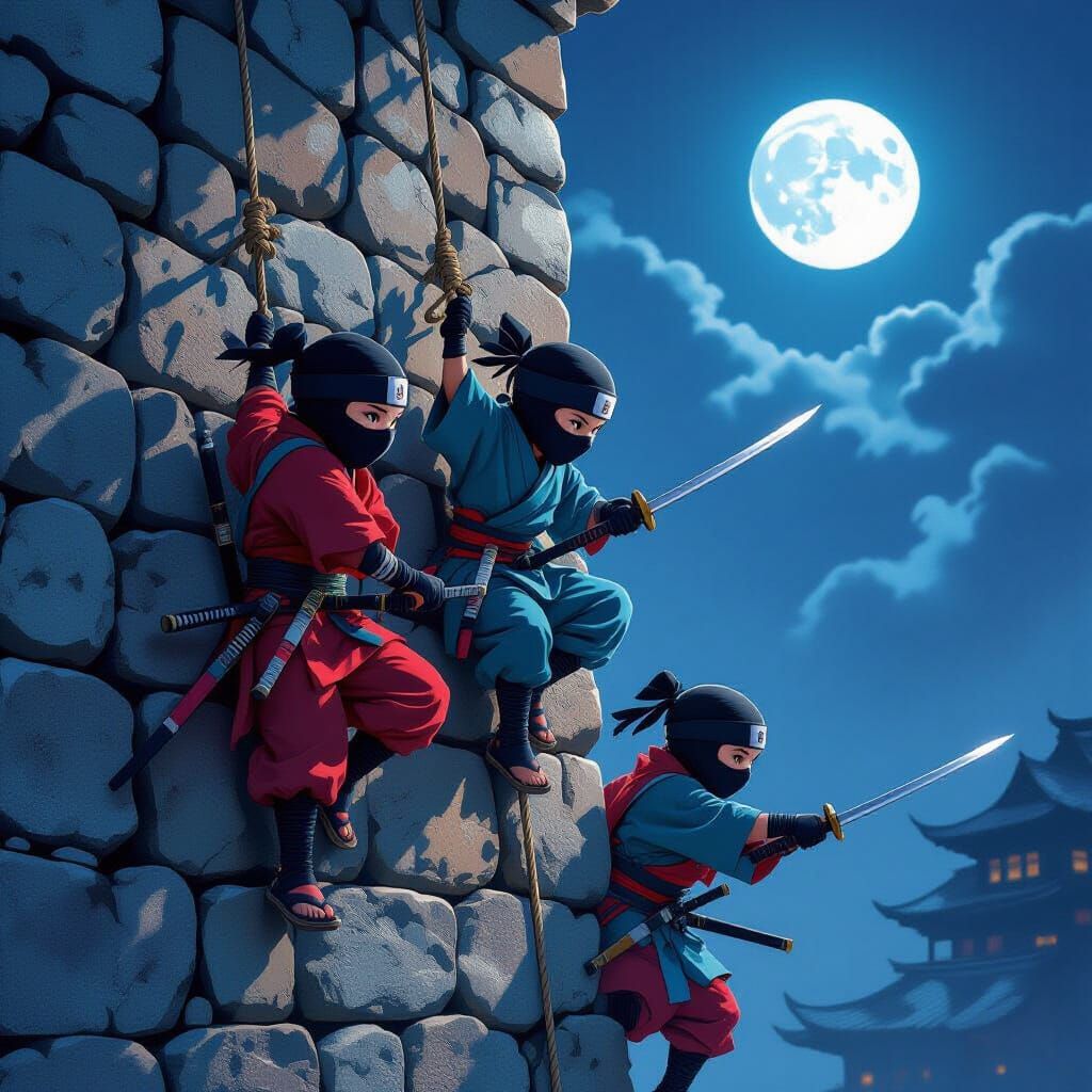 This image depicts young ninjas scaling a high stone wall under the moon's glow. They are dressed in colorful ninja gear and use ropes and grappling hooks to ascend in a photorealistic style with dramatic shadows.