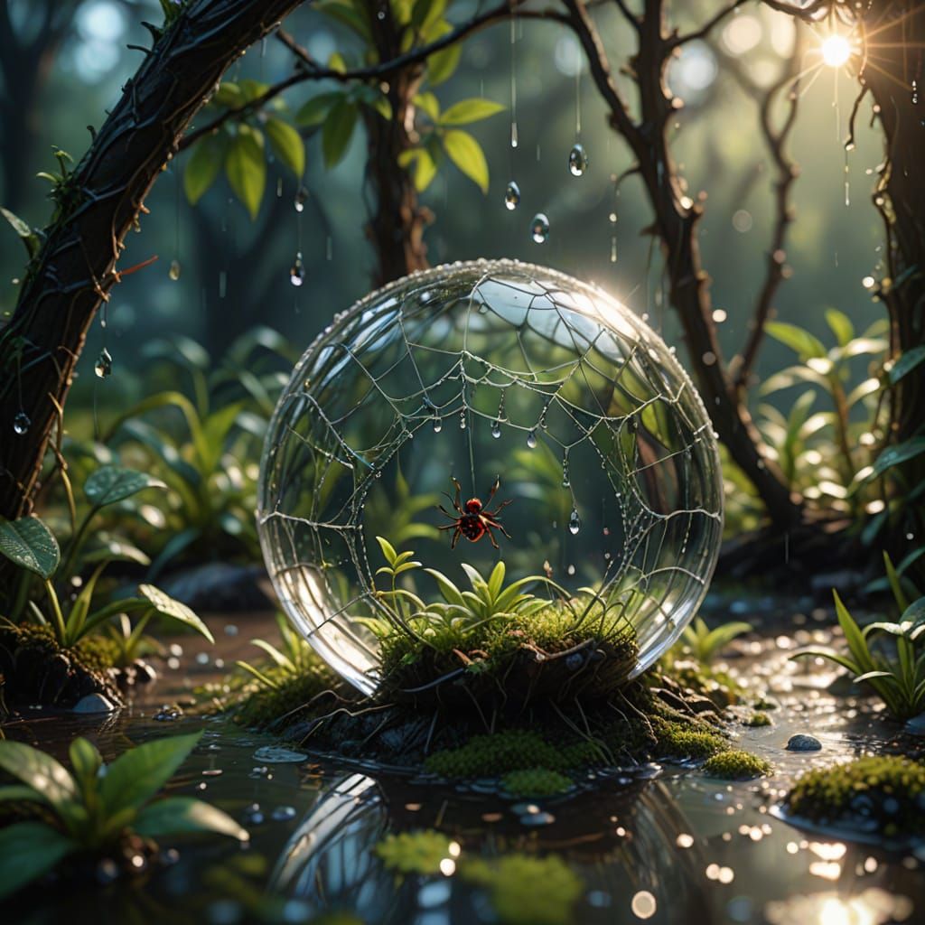 A hyperrealistic digital artwork of a miniature world contained within a water droplet on a spiderweb. The image features glowing plants, detailed silk, and soft, cinematic lighting.