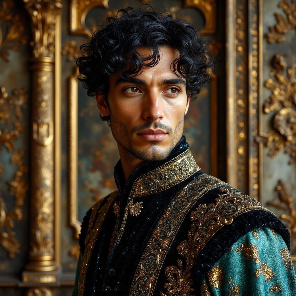 A striking portrait of a handsome man in 16th-century attire. The man wears a black velvet tunic with turquoise and gold sleeves, set within a lavishly decorated chamber, rendered as a maximalist oil painting.