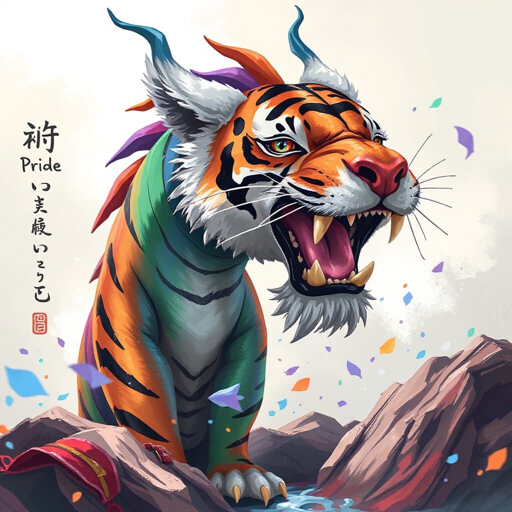 This image showcases a vibrant digital painting of a dragon fish and tiger, celebrating pride month. The artwork features a colorful, deviantart style.
