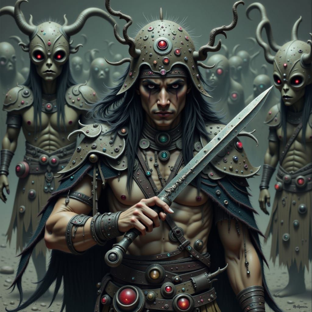 A depiction of a Native American vampire shaman battling aliens in a desolate wasteland. The scene evokes a dark, gothic atmosphere with intricate details and eerie lighting, reminiscent of a dark fantasy horror setting.