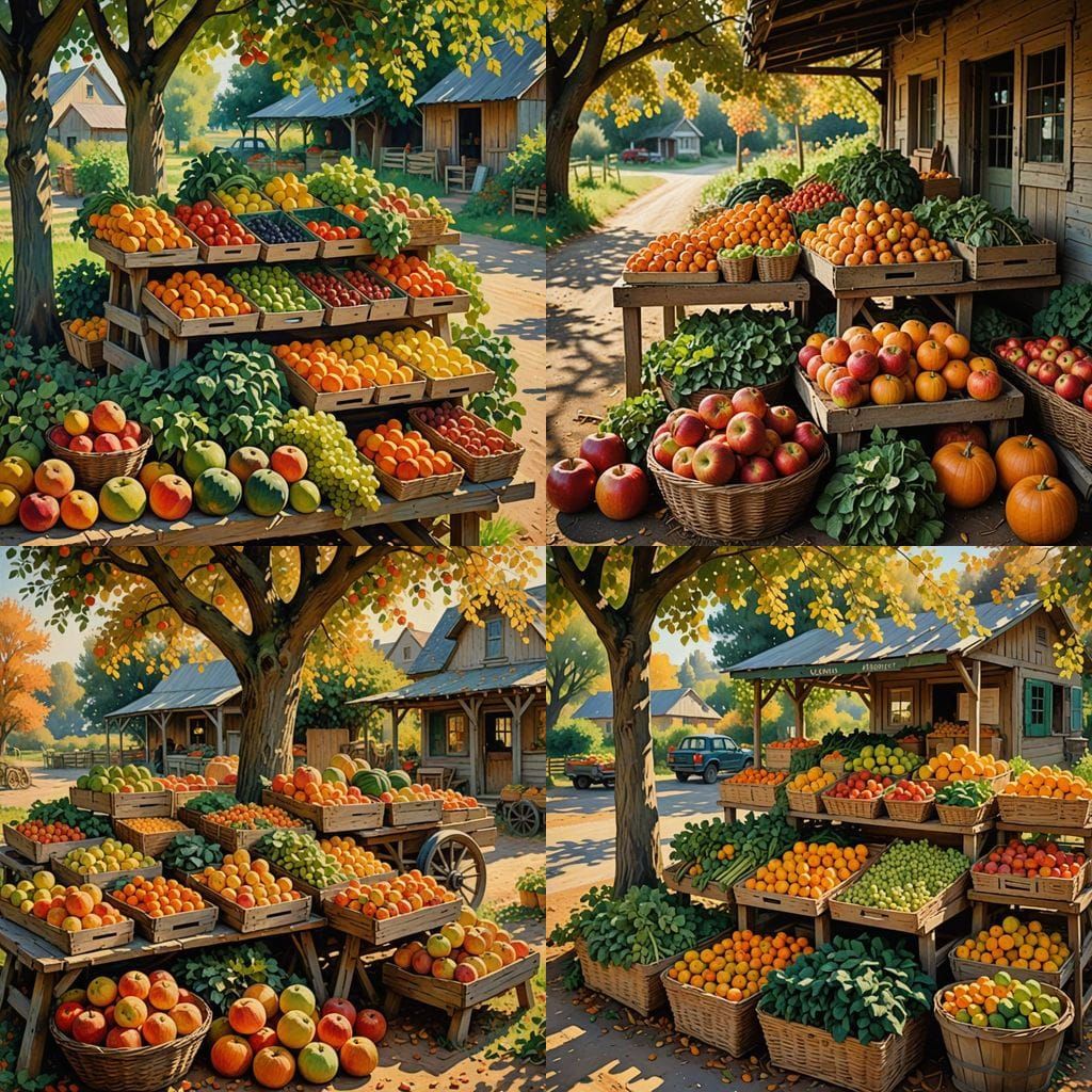 A vibrant image of a wooden farmstand brimming with fresh produce. The scene is bathed in natural light, rendered with soft brushstrokes and a warm color palette, reminiscent of impressionist countryside paintings.