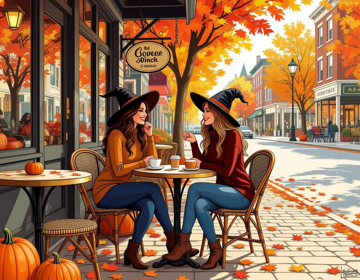 This image shows a lesbian witch couple holding hands at a cafe on an autumn night. The scene is rendered in a realistic comic book style with bold lines and a warm color palette.