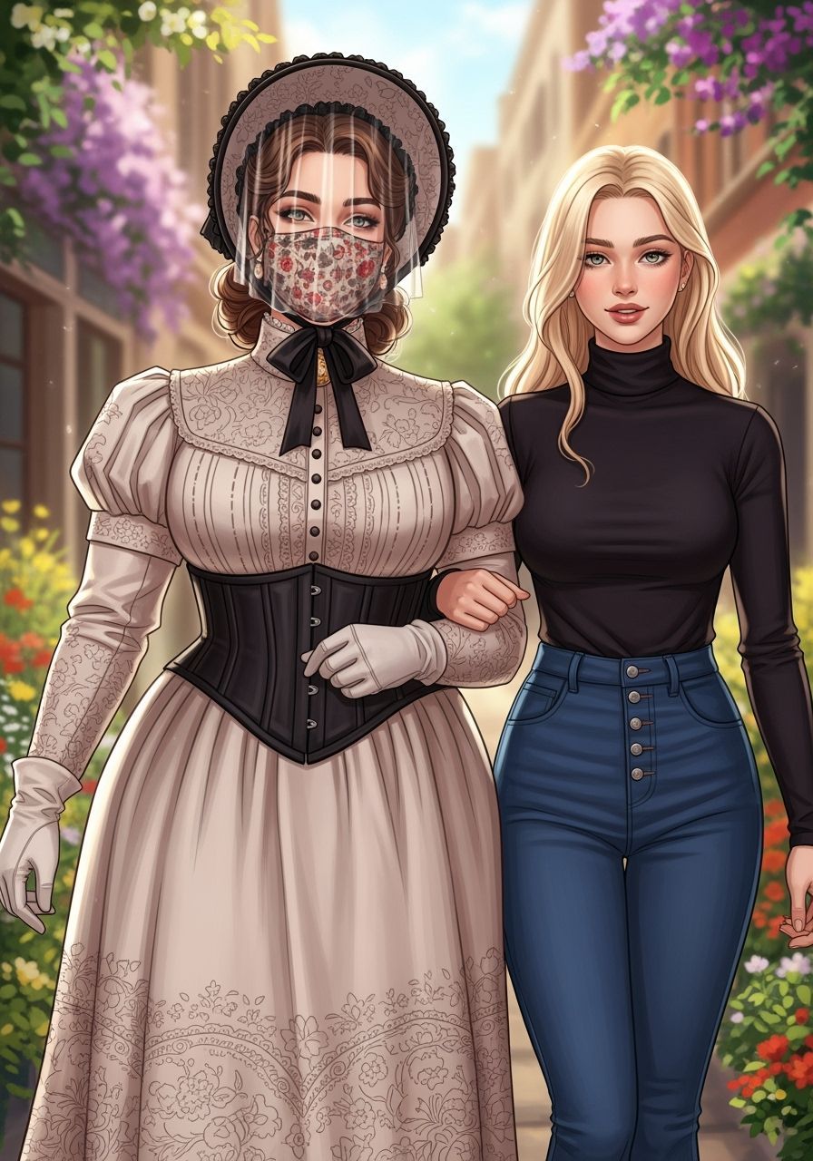 This image shows two women walking in a sun-drenched modern city filled with flowers. One is wearing modest 1850s attire, including a veil, while the other is in modern clothing, rendered with soft romantic glow as an impressionist painting.