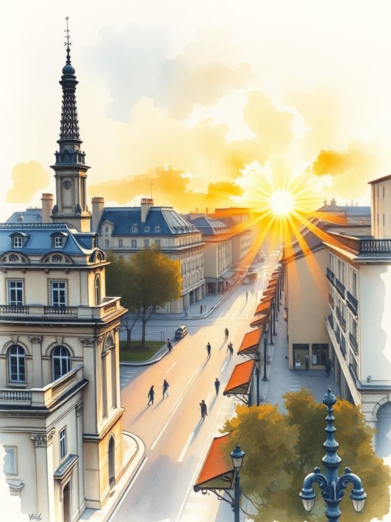 A watercolor painting of Paris city at sunrise, capturing the city's landmarks in soft, impressionistic light with rich tones and wet-on-wet technique