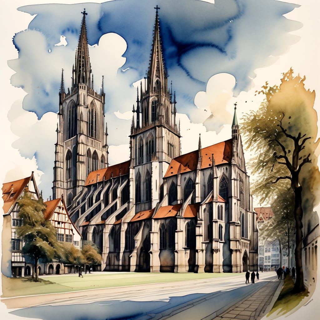 This image depicts a picturesque church with a tall gothic tower in a German city, rendered in a watercolour style reminiscent of Arthur Rackham's intricate illustrations.