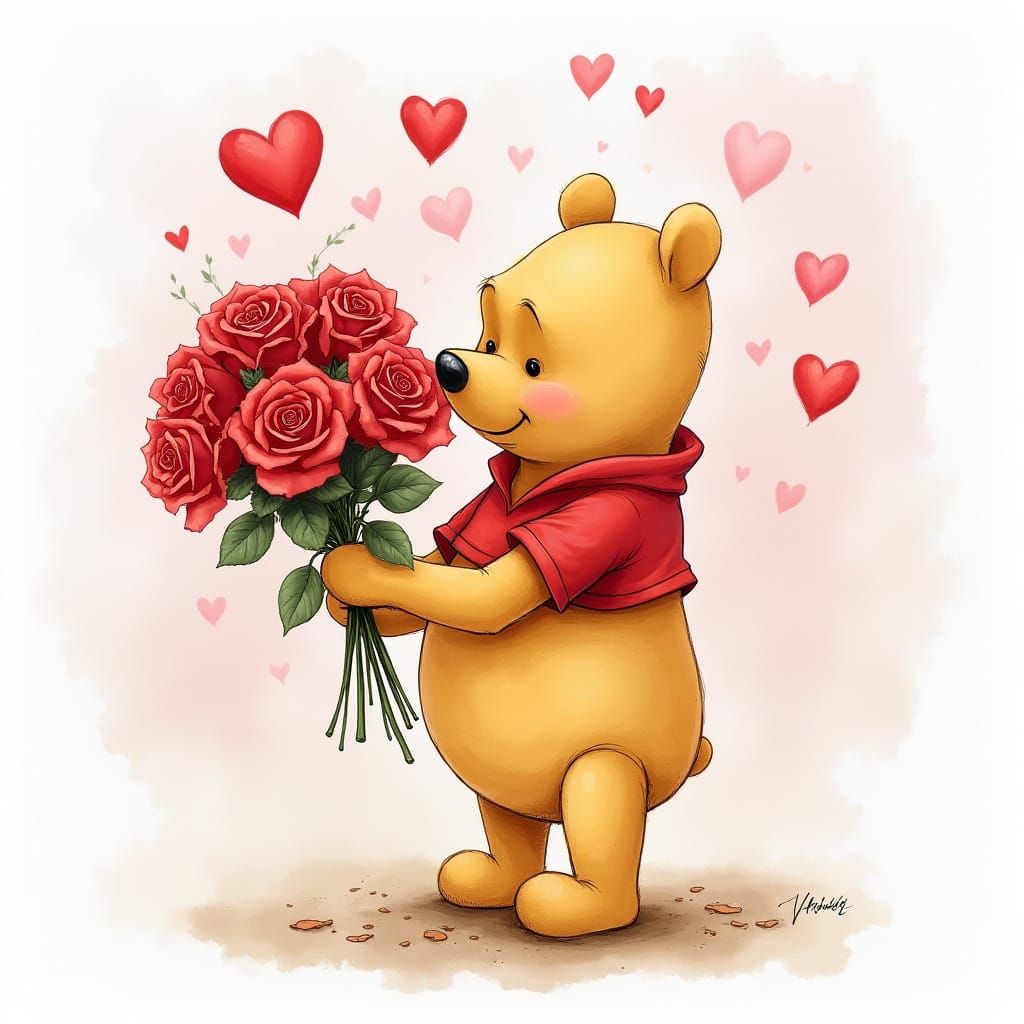 This whimsical watercolour image features Winnie the Pooh tenderly holding a vibrant bouquet of red roses, perfect for Valentine's Day.