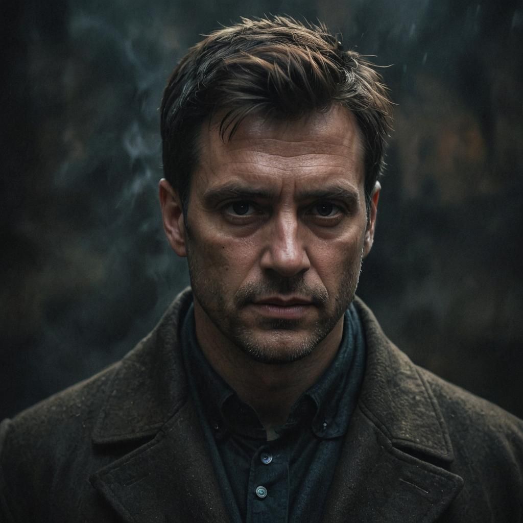 This image shows a close-up of a 40 year old man with short brown hair and a clean shave, wearing a worn coat in a dark fantasy setting. Moody colors, deep shadows, and atmospheric lighting create a dramatic and ominous mood.