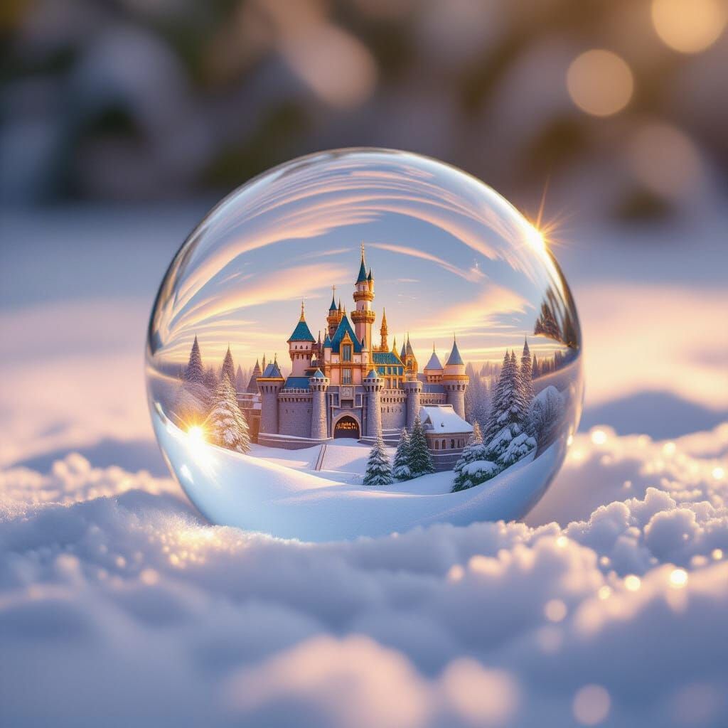 A photorealistic glass orb rests in snow, reflecting a miniature winter city. Soft bokeh lights create a magical, festive atmosphere with golden hour lighting.