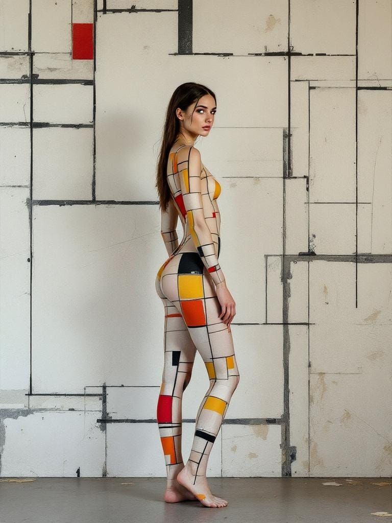 A striking picture of a woman whose body paint merges with a geometric wall design. The image evokes the wabi-sabi aesthetic with layered textures and dimensional rifts, reminiscent of impasto art.