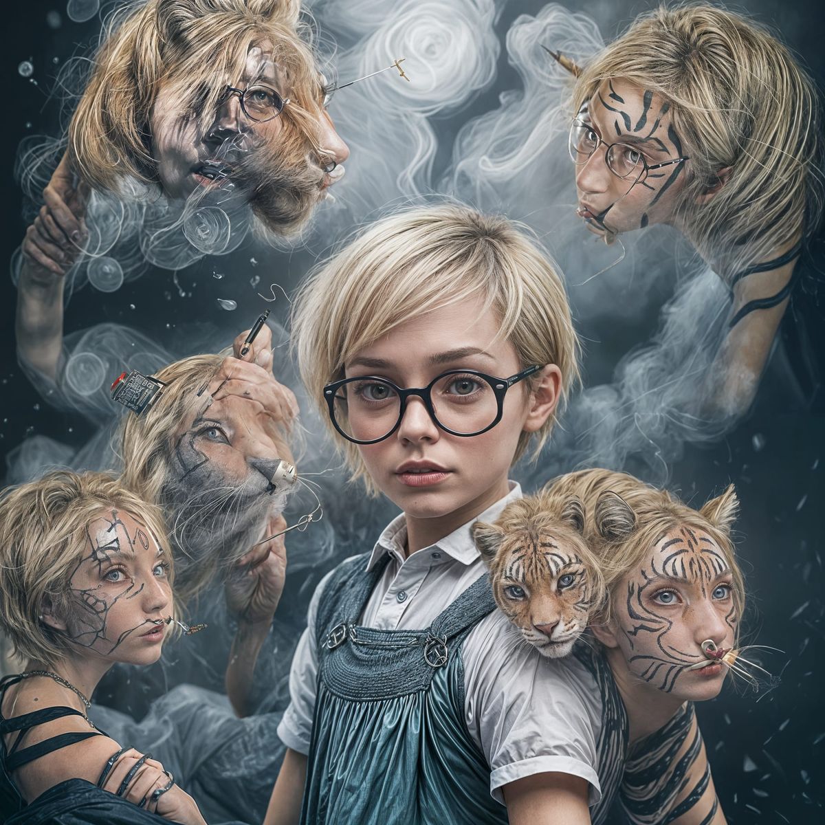 This image shows a fashion poster featuring a model in a Tim Burton-esque aesthetic. The model has short blonde hair, wire glasses, and is holding a cigarette.