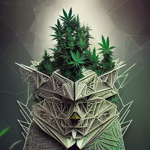 A hyper-realistic collage shows an intricate forest made of cannabis buds. Geometric origami newspaper textures create depth, rendered with 3D liquid detailing and subsurface scattering.