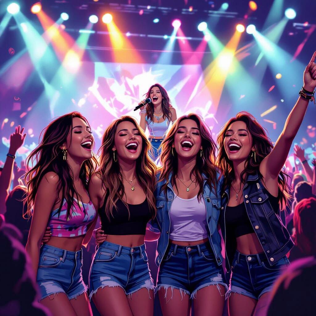 This image captures four friends ecstatically reacting at a Tate McRae concert. Tate performs on stage as the girls scream with joy, surrounded by vibrant lights and dynamic comic book art style.