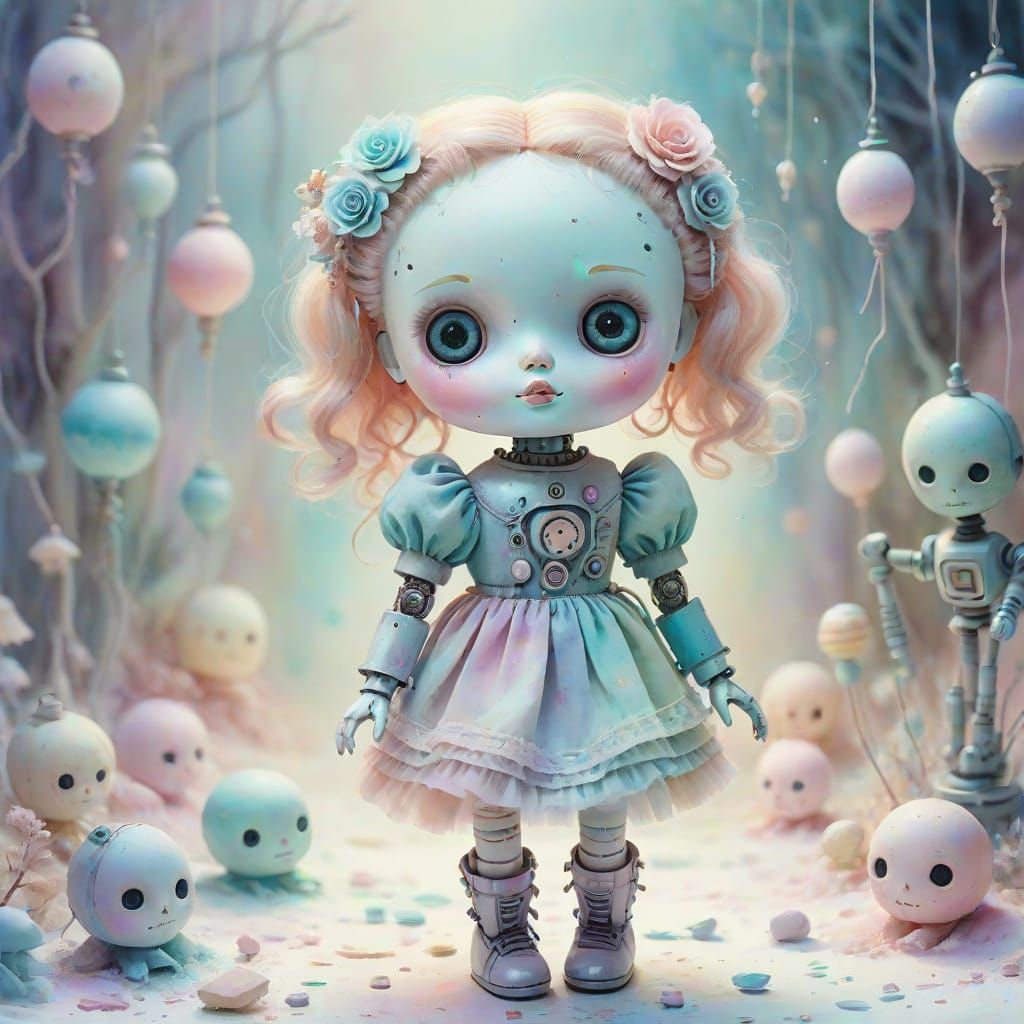A surreal watercolor painting of a creepy doll moving robotically through a dreamy pastel wonderland. Delicate brush strokes and soft lighting create a whimsical, ethereal scene.