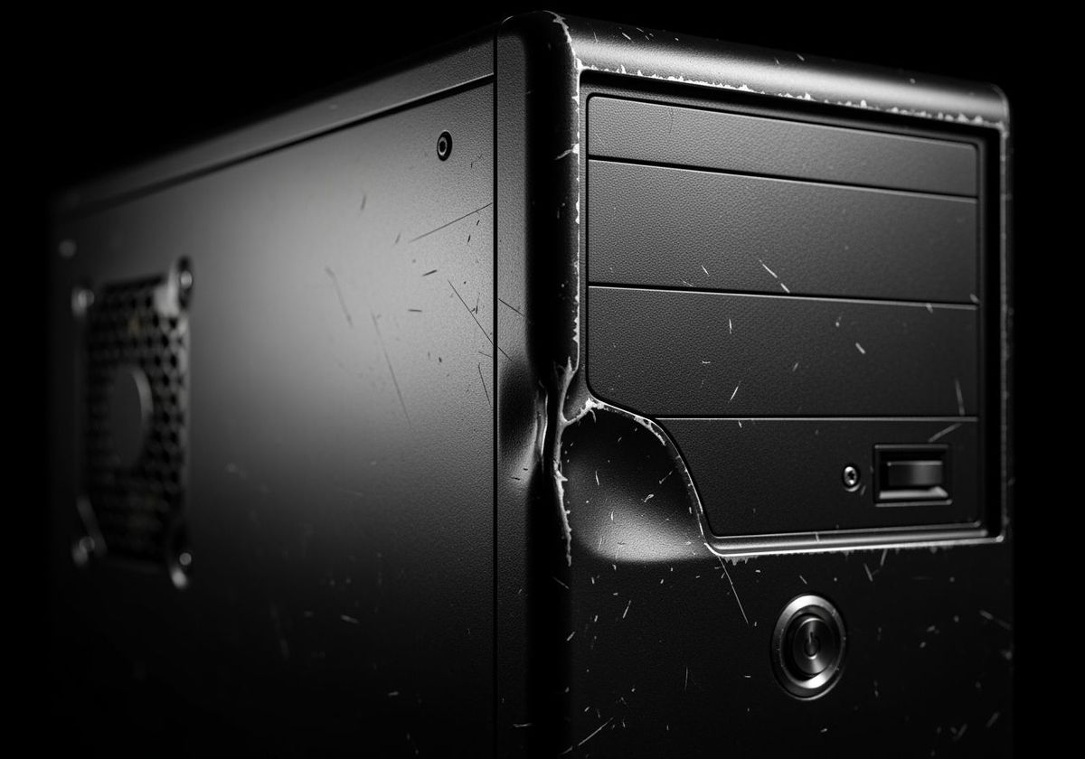 This image showcases a photorealistic, macro portrait of a black aluminum computer case, detailed with scratches and worn anodization. Dramatic Rembrandt lighting highlights its moody, dignified patina against a dark background.