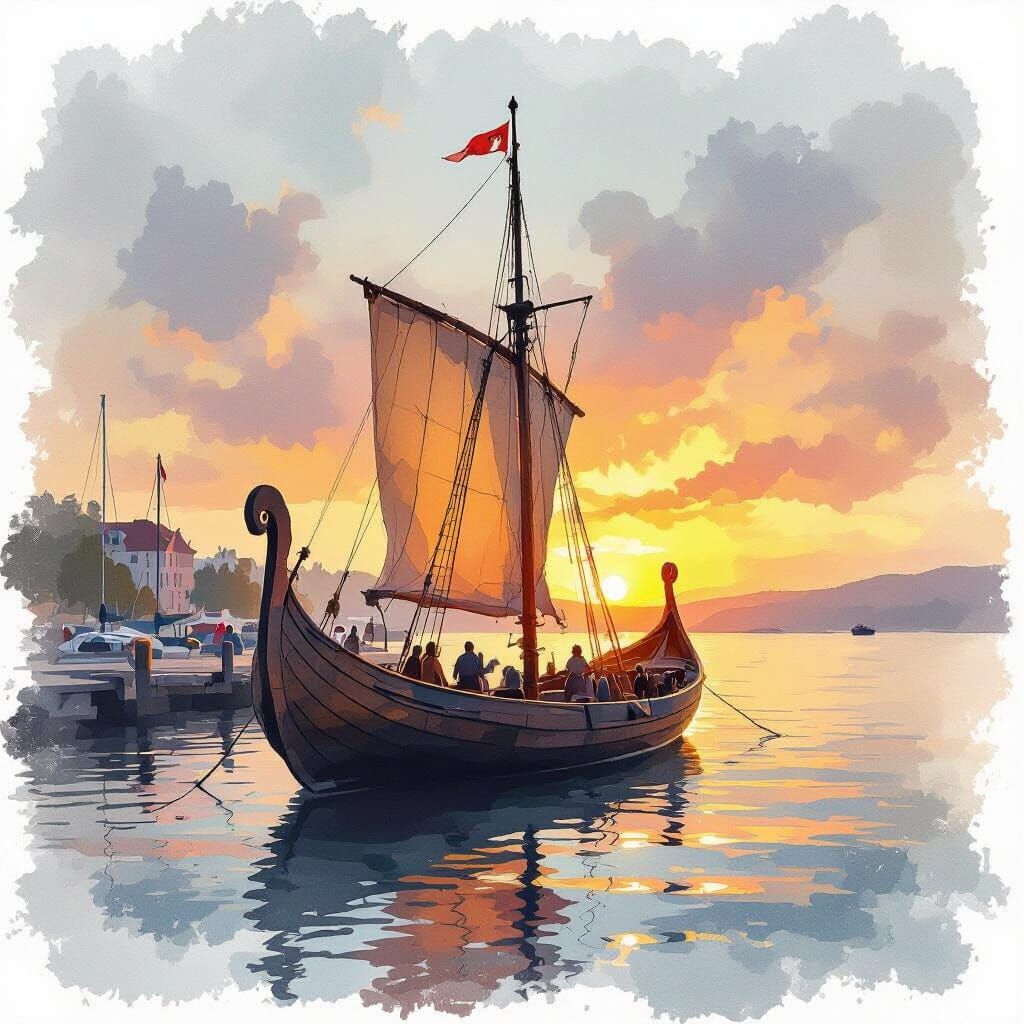Watercolor of sunset with a viking long boat at harbour, This artwork harmoniously blends Willem Haenraets, Eugen Chisnicean, Paul Klee styles with the delicate, expressive watercolour techniques and the ethereal, cinematic stylization of WLOP, resulting in a mesmerizing fusion of chaos and beauty. fine-tuned ...
