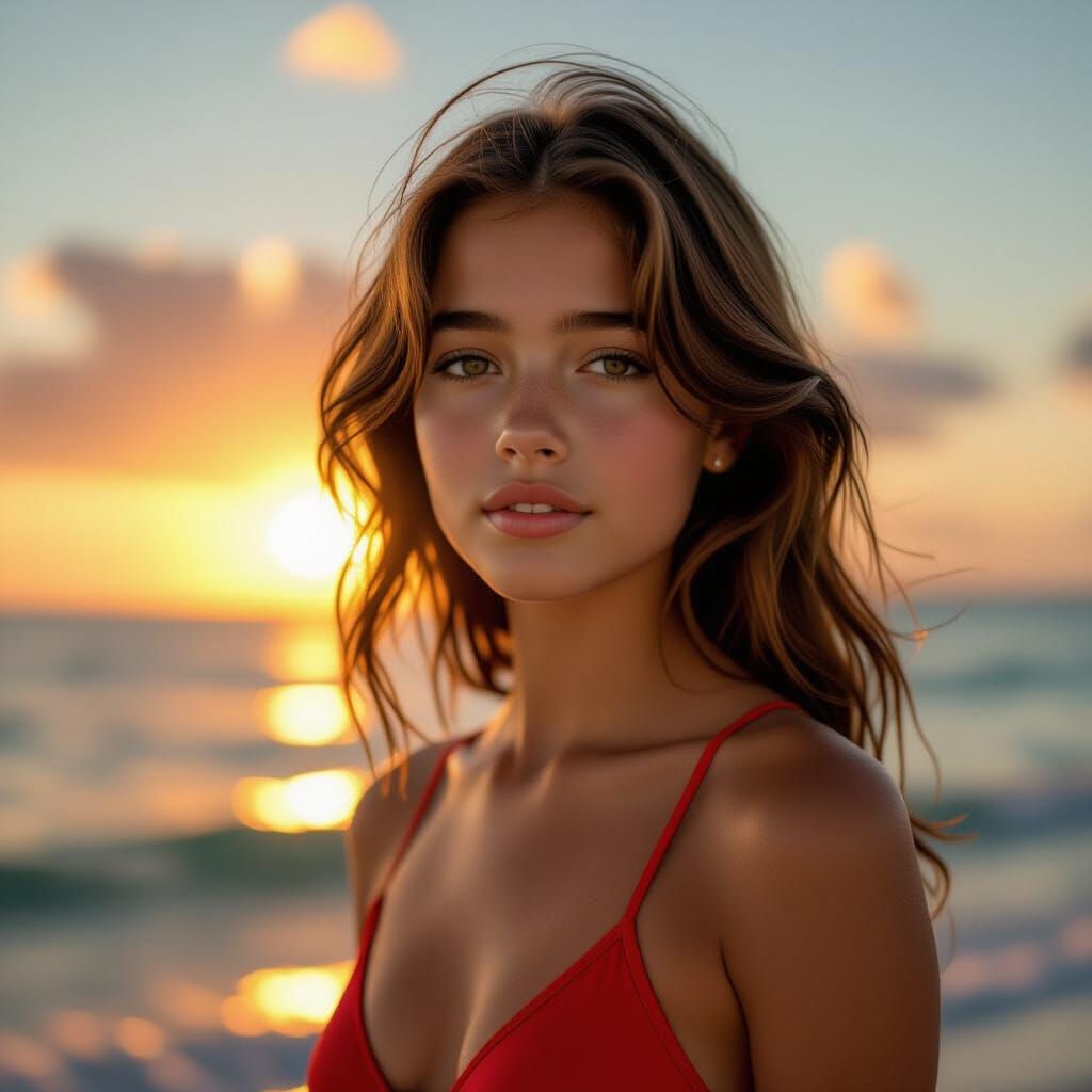 This image shows a teenage girl with brown hair in a red swimsuit, standing by the ocean during a vibrant sunset. Golden hour lighting creates dramatic effects.