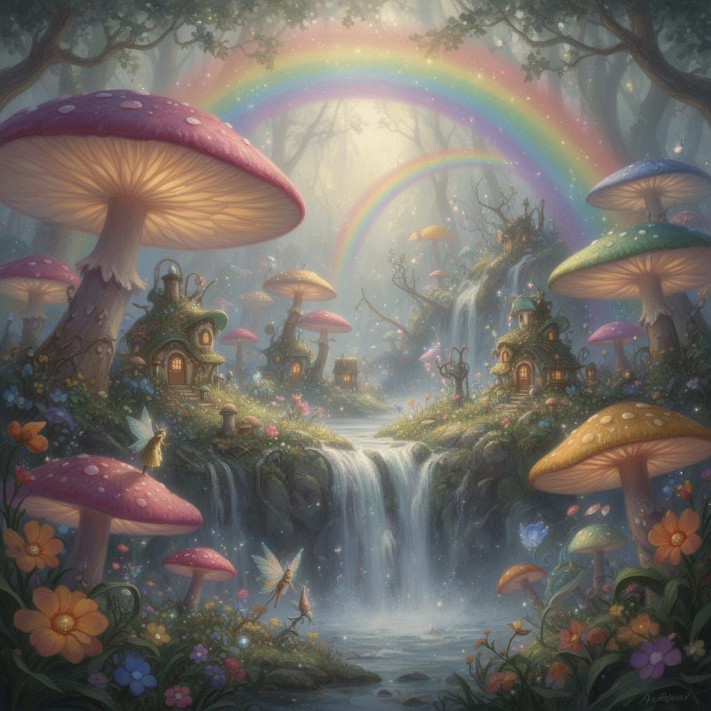 A miniature fairy town with tiny tree houses, oversized mushrooms, and sparkling waterfalls. Arches of rainbow fill the dappled light in this detailed digital painting.