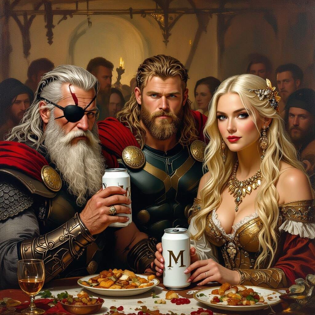 This image shows Norse gods Odin, Thor, and Freya at a grand feast. The Renaissance-style painting features warm lighting and intricate details, reminiscent of classic masters.