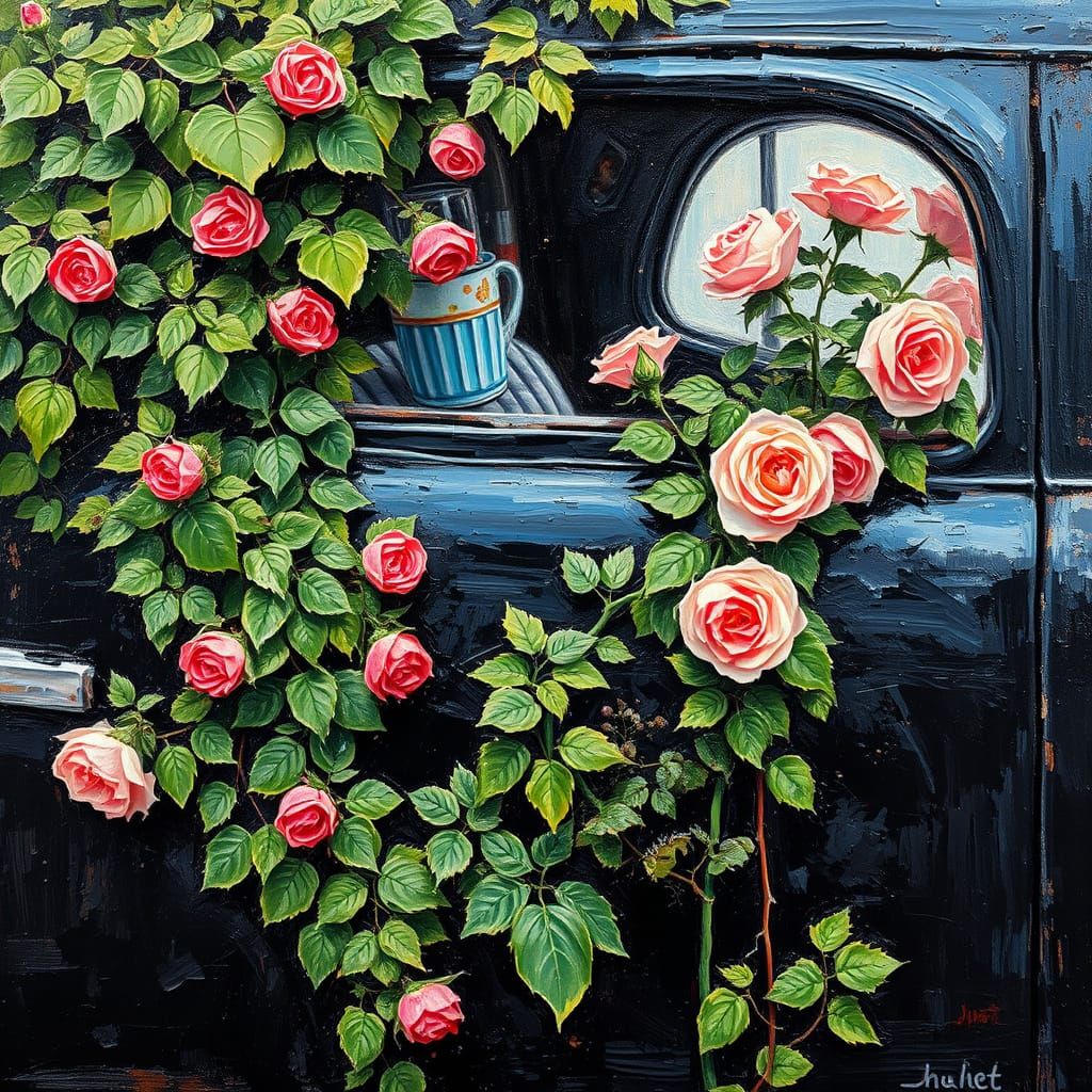 A neo-impressionistic painting of a black 1950's Ford car door. Ivy and roses spill out of the window in an expressionist, textured style with thick layers of colorful paint.
