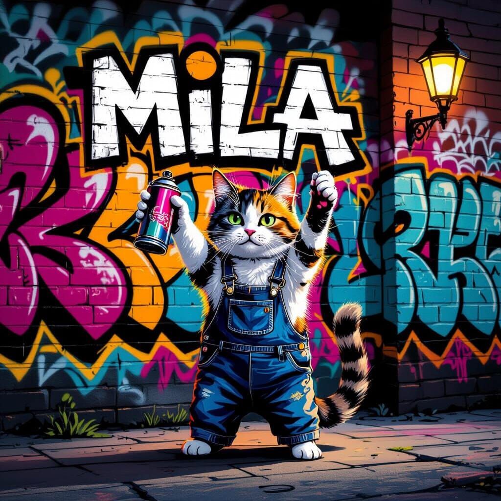 This image depicts a cat in overalls holding a spray can, ready to create graffiti art on a brick wall. The scene features vibrant street art and dramatic lighting, rendered in a gritty urban art style.