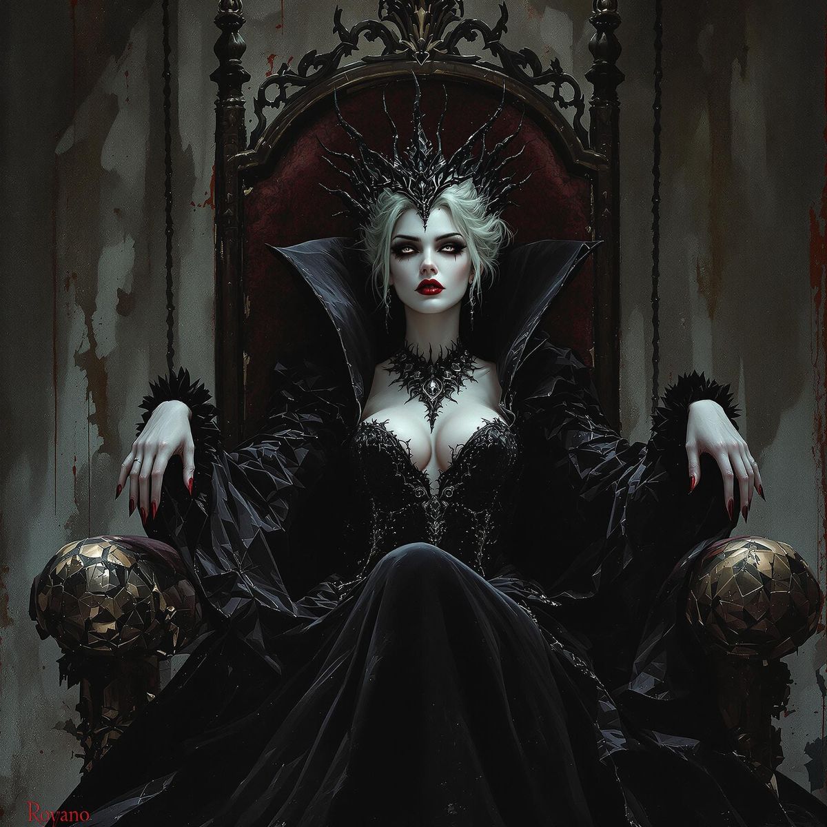 A haunting portrait of a vampire queen, surrounded by dark opulence and dramatic lighting, showcasing the beauty of melancholic, non-realistic art
