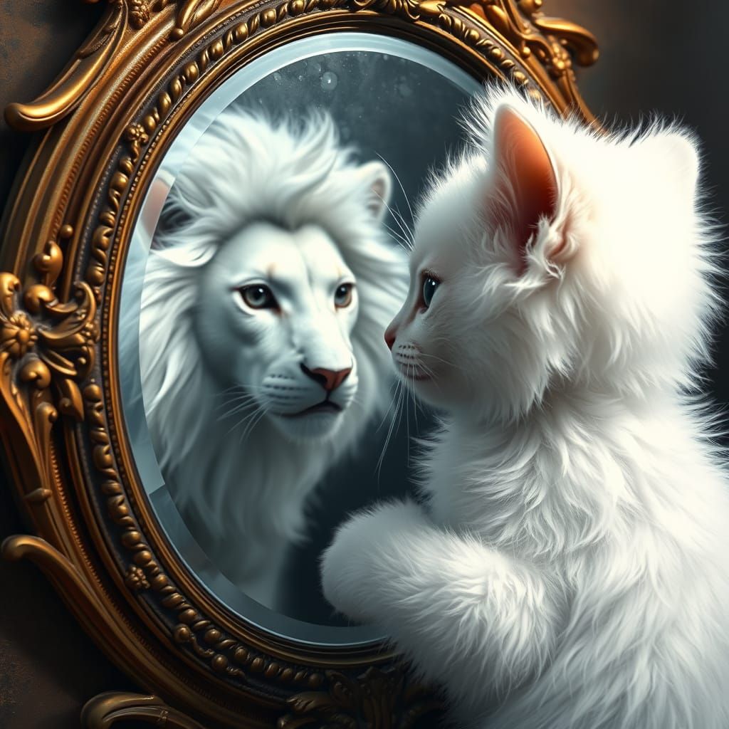 This image shows a fluffy white kitten gazing into an antique mirror, with its reflection appearing as a majestic white lion. The image is a detailed, high-resolution digital painting.