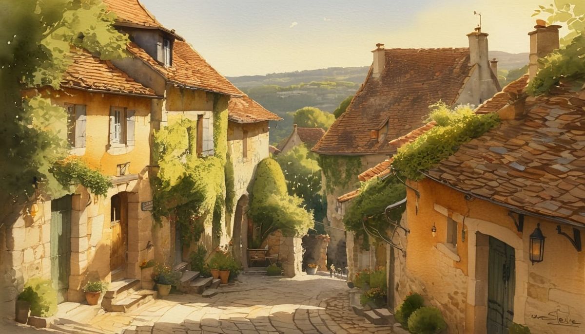 A picturesque scene of a medieval village in France rendered in watercolor. The image captures the golden light and warm tones of the architecture in an impressionistic style.