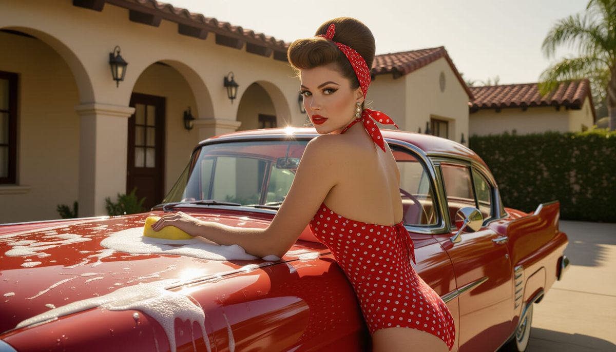 A hyperrealistic concept art photo of a rockabilly woman washing a vintage red Cadillac. Cinematic lighting creates dramatic shadows in this scene.
