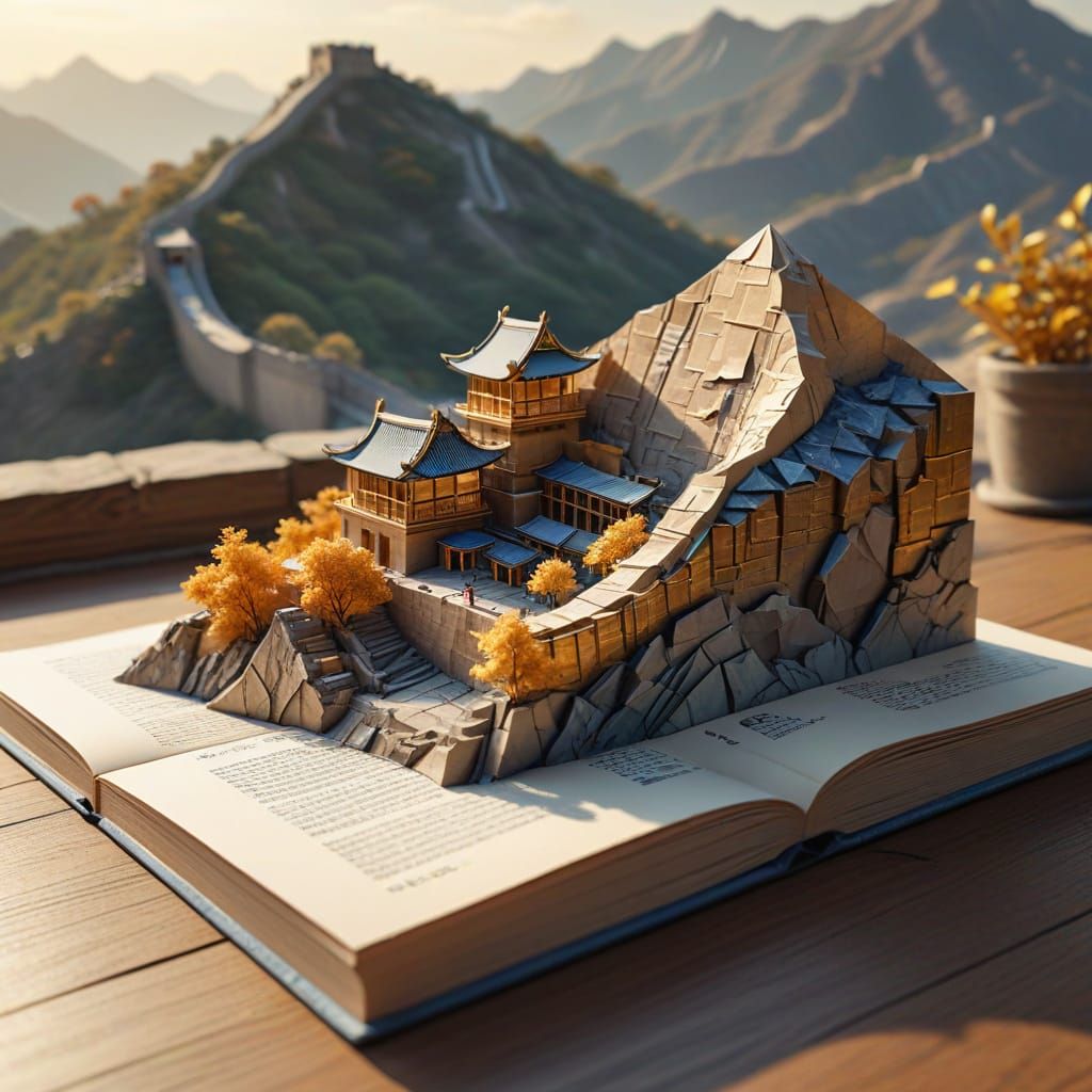 This academic illustration depicts the Great Wall of China with book stalls. Features ancient, classic, and digitally projected books, rendered with vibrant ink washes and papercraft elements.