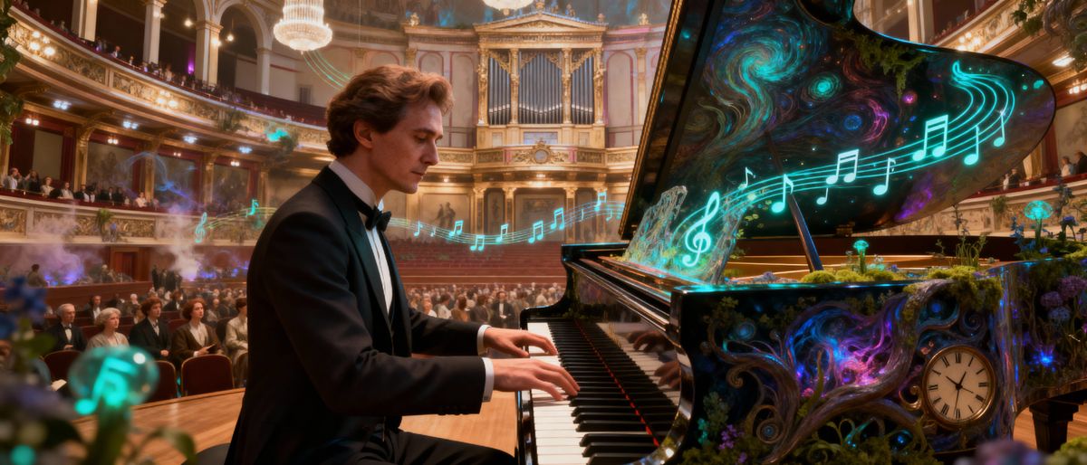 This image depicts a hyperrealistic, surreal journey through music history. It features a dreamlike 3D style with bioluminescent highlights, evoking deep emotions and memories.