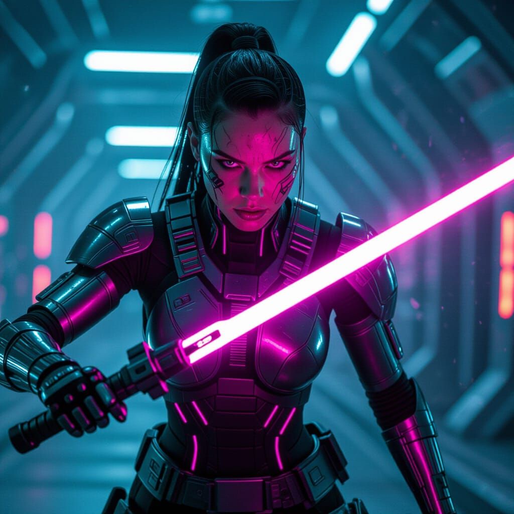 This image shows a cyborg warrior on a metallic planet, enhanced with glowing neon circuits. She wields a plasma sword, rendered with atmospheric lighting in a cyberpunk aesthetic.