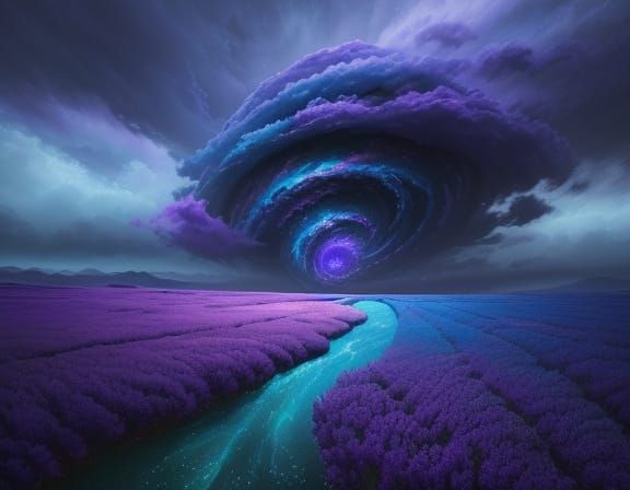 This image depicts a figure in a dreamlike landscape with vibrant, triadic colors. Swirling purple and blue clouds are illuminated by glowing moonlight, creating an ethereal atmosphere. Rendered in a detailed, cinematic digital art style.