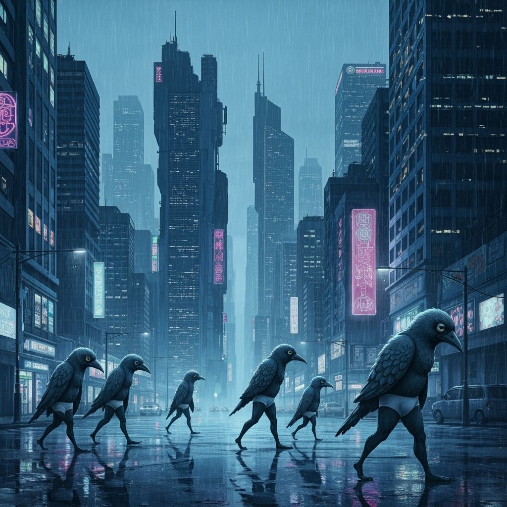 This image shows dejected anthropomorphic birds in white briefs walking in a treeless Tennessee landscape. The graphic illustration features soft lighting, sharp focus, and intricate details, rendered as digital art.