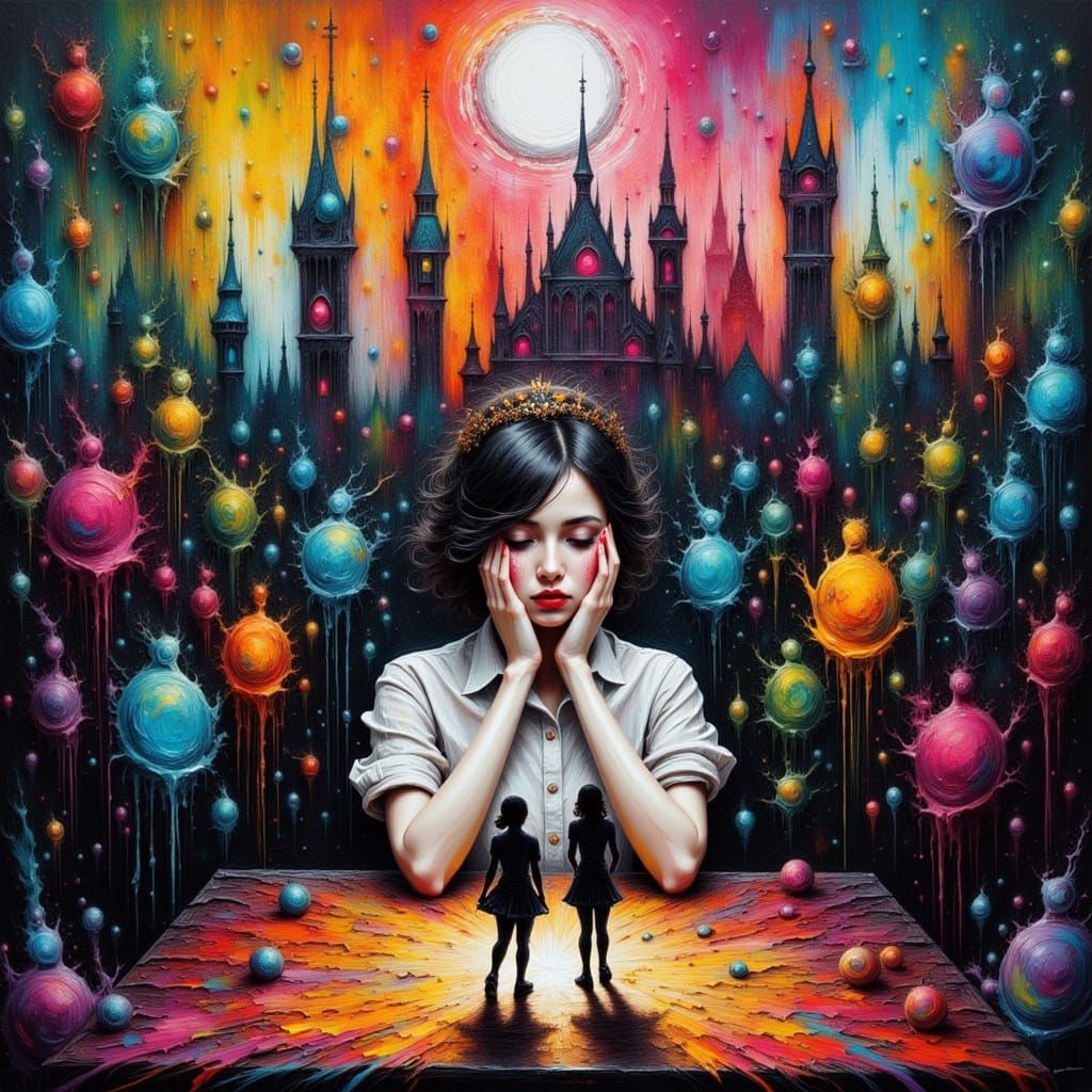 Headshot, a girl sitting at a table crying. Her tears are forming silhouettes of people on the table. Hysterical crying, depicted, Hyperdetailed , oil, textured, tears creating people, colorful, hyper-detailed, realistic, splash, silhouette, tears, <lora:Impax v2:1.0> <lora:ComplexionV2:1.0> <lora:Chroma:1.0> ...