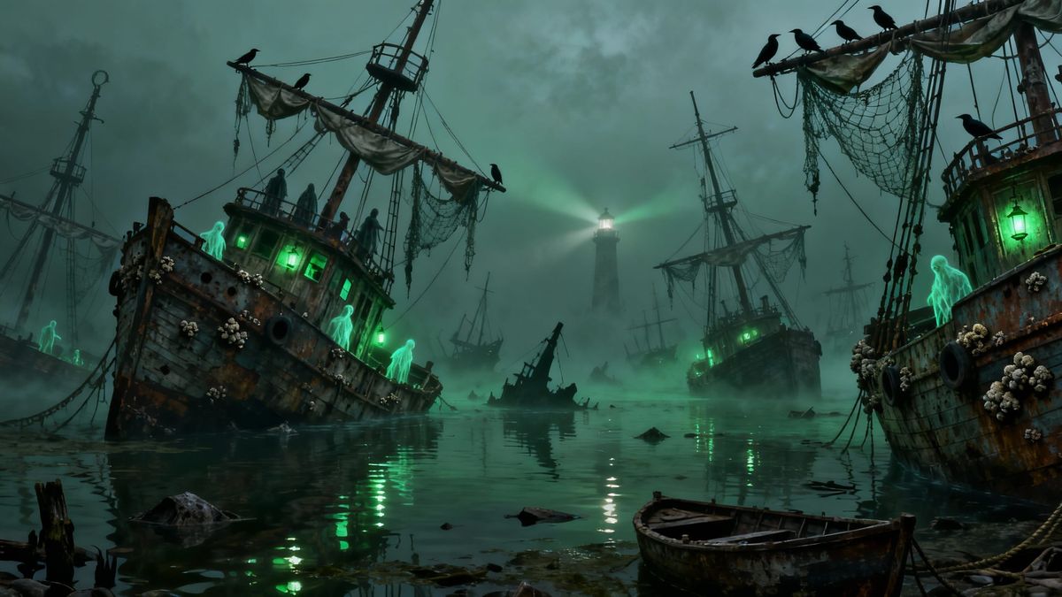 This image depicts dozens of derelict wooden ships in shallow, foggy waters. Abandoned vessels with tattered sails and decayed hulls create a haunting, unsettling scene in dark fantasy concept art.