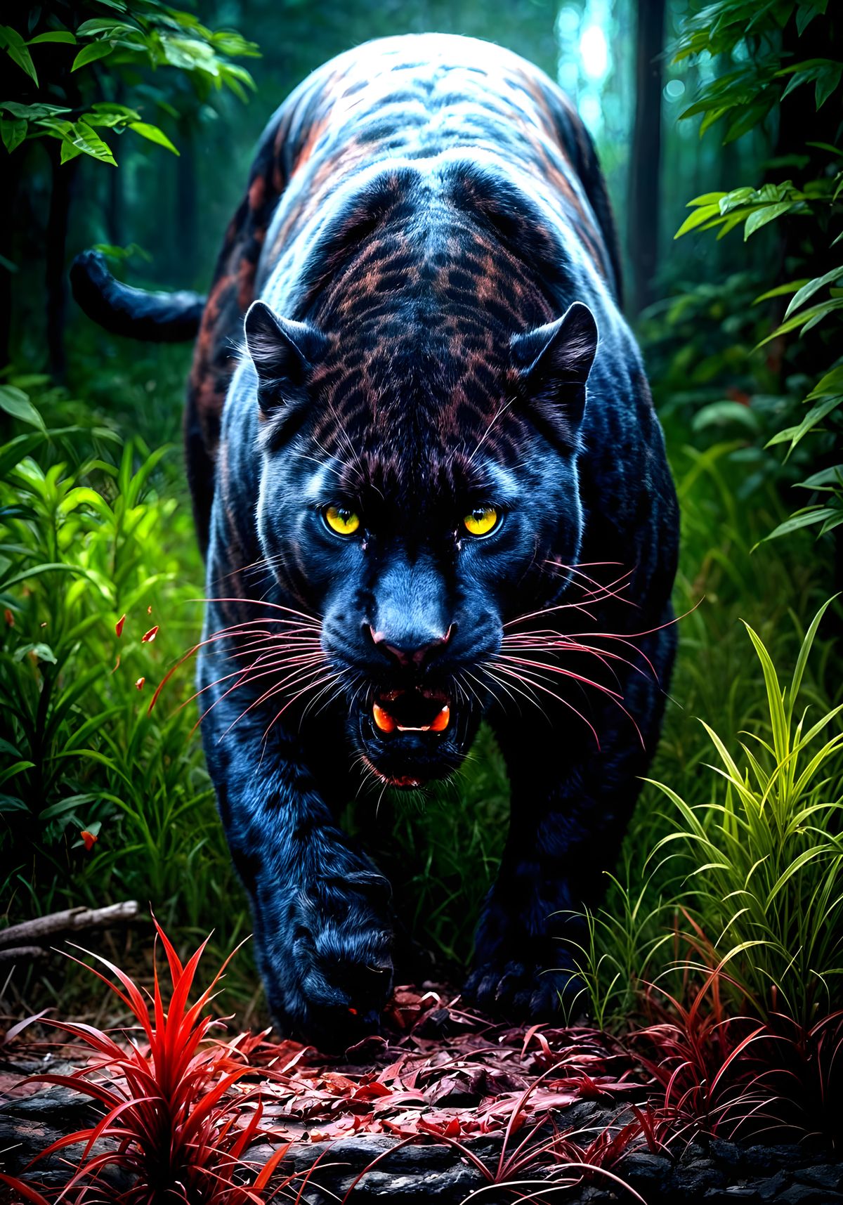 This image captures a stunning aerial view of a black panther in mid-predation, with vibrant pinkish-red hues emanating from the blood-soaked fur, set against a hyper-realistic 4-dimensional background of trees and grass.