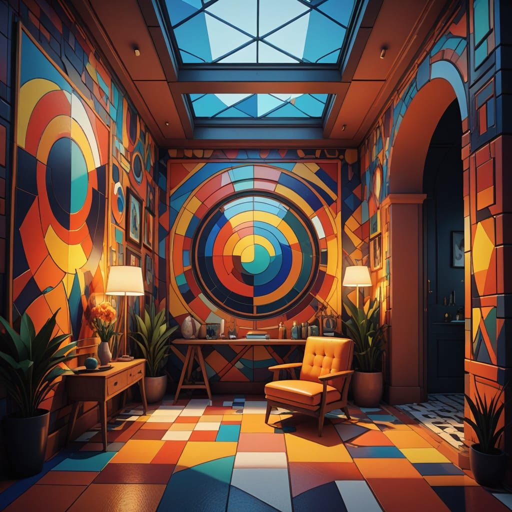 This image presents an emotional landscape within a heat chamber, rendered in a vibrant Cubist Art Deco style. It features layered, overlapping geometry and sandstone walls glowing with dry heat, in an angular oil painting aesthetic.