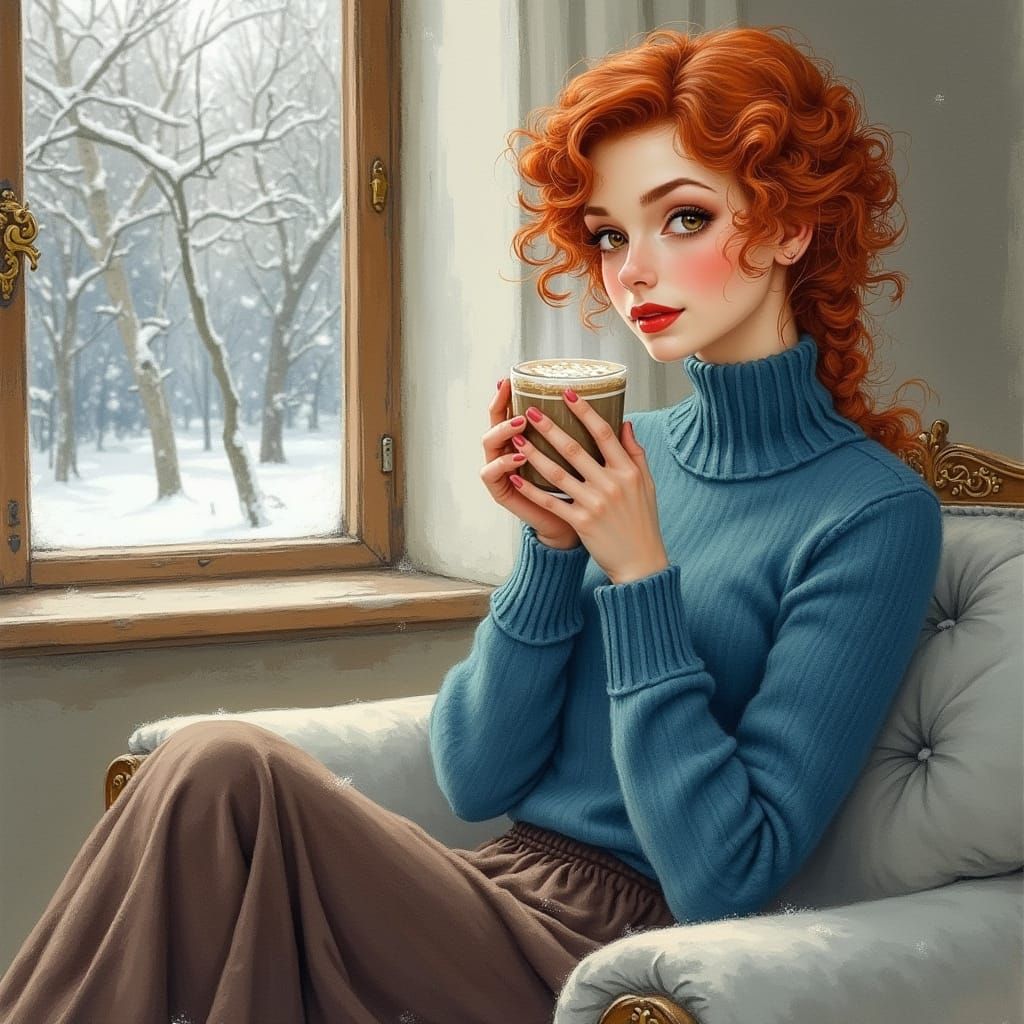 A watercolor painting of a beautiful woman with red curly hair and hazel eyes enjoying hot chocolate. She wears vintage clothing in an art nouveau style.