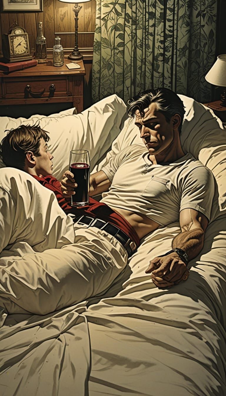 This image captures a serene moment of a man falling asleep on a bed, surrounded by the warm glow of a house and a glass of wine, in a nostalgic and cinematic style reminiscent of classic comic book art.