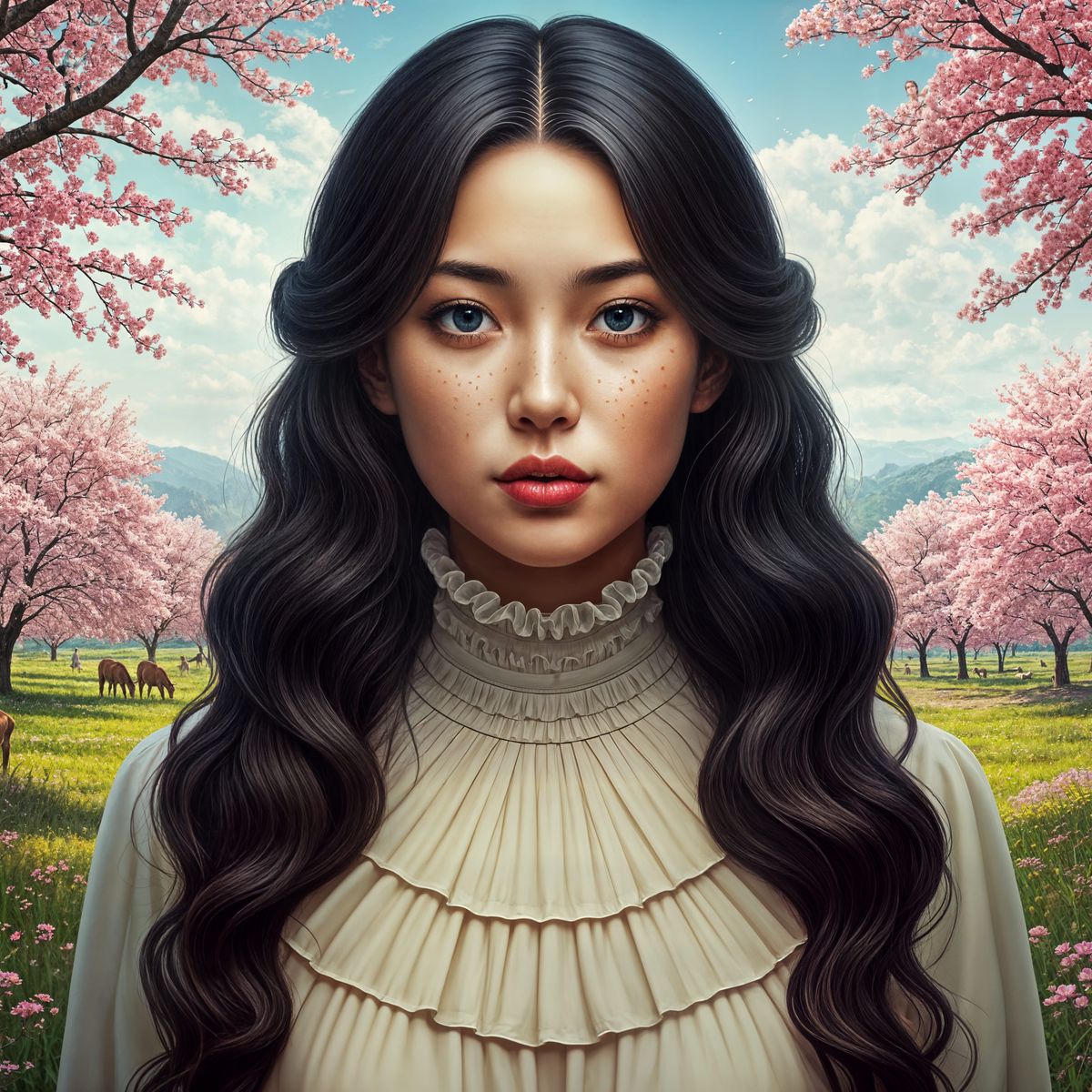 A breathtakingly detailed portrait of a woman amidst a serene farmland backdrop, surrounded by cherry blossoms and animals, showcasing exceptional realism and beauty